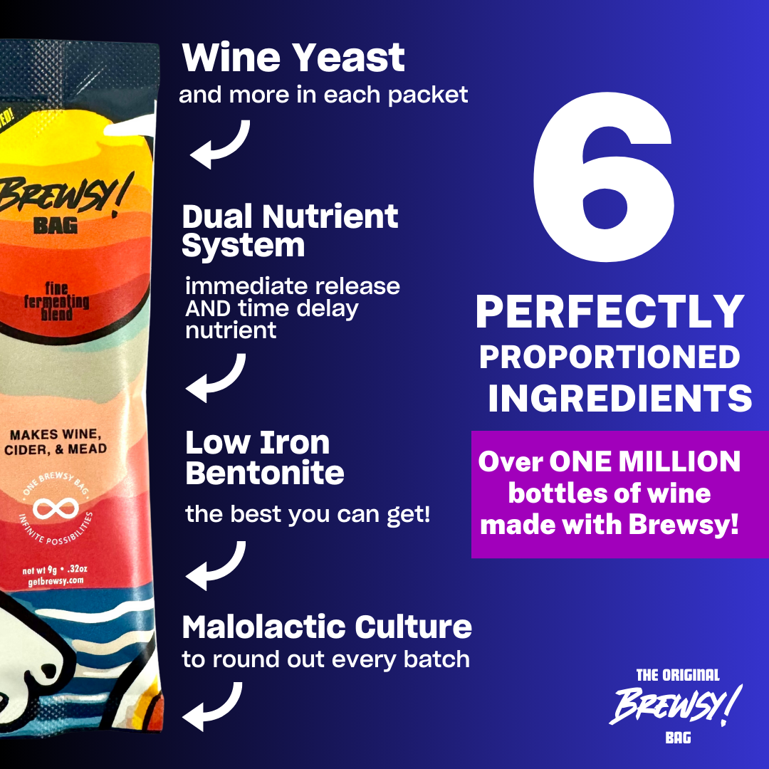 Each Brewsy Starter Kit with Glassware can make up to 36 bottles of wine to enjoy and make with friends & family!